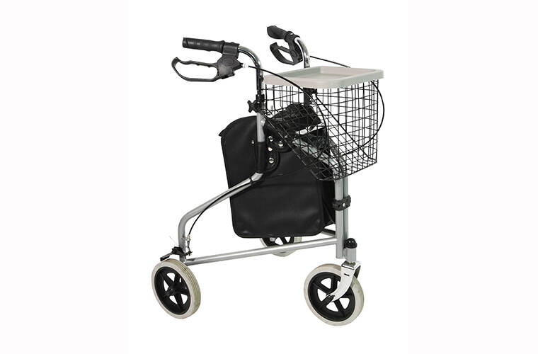 Ce rollator est doté de 3 roues, de poignées anatomiques et de freins à câbles.